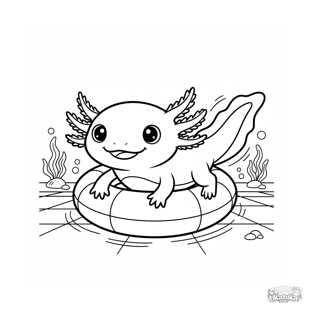 Coloring page for kids 4-6: a cute axolotl swimming through an inflatable ring at the bottom of a pool. A fun and simple scene for creativity.