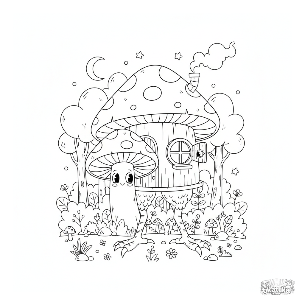 Coloring page for kids 4-6 from a Russian fairy tale: Baba Yaga's hut on chicken legs peeks from behind a giant mushroom in the forest. A mysterious, iconic scene.