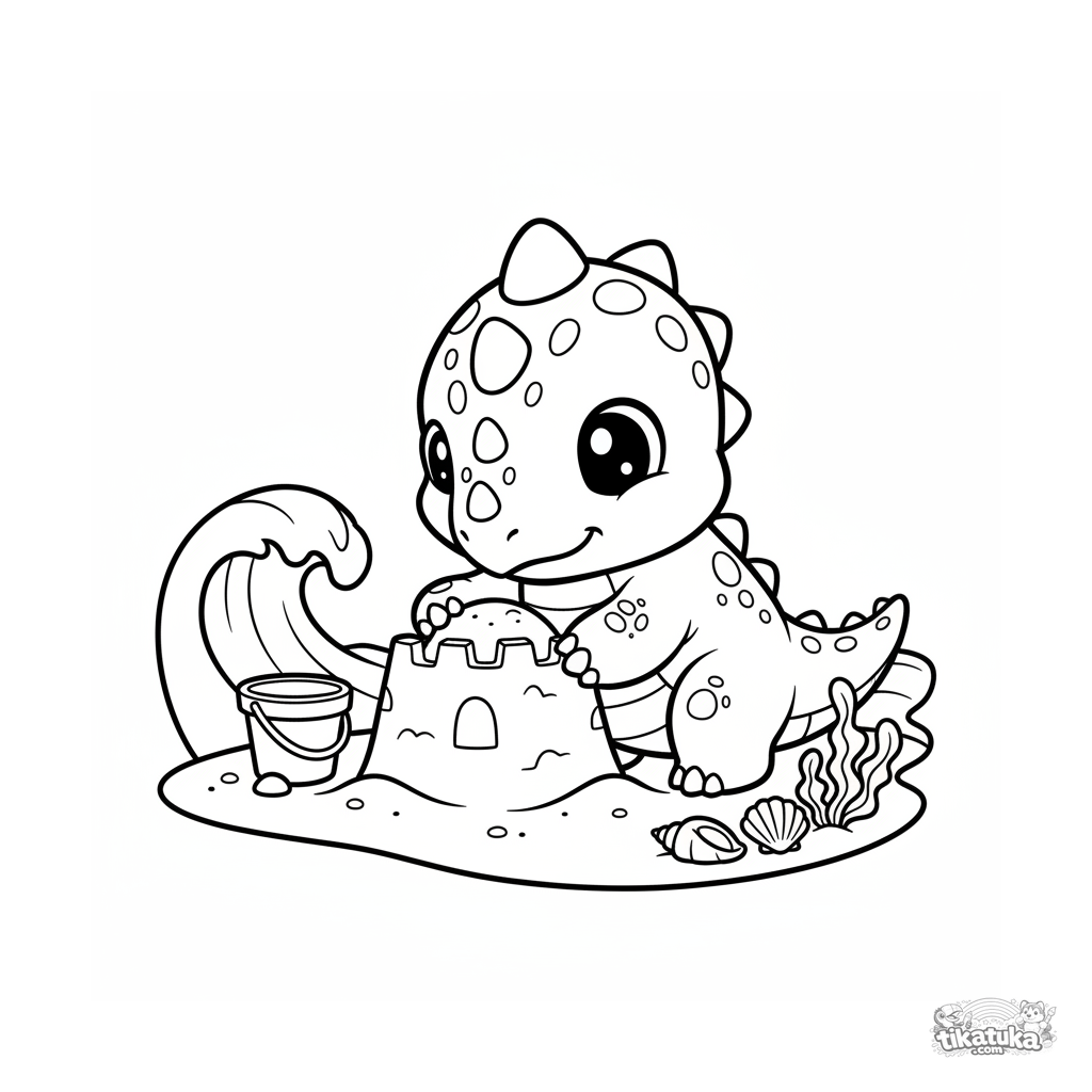Simple coloring page for toddlers: a baby ankylosaurus building a sand castle on an ancient ocean beach. Large shapes, few details. For ages 2-3.