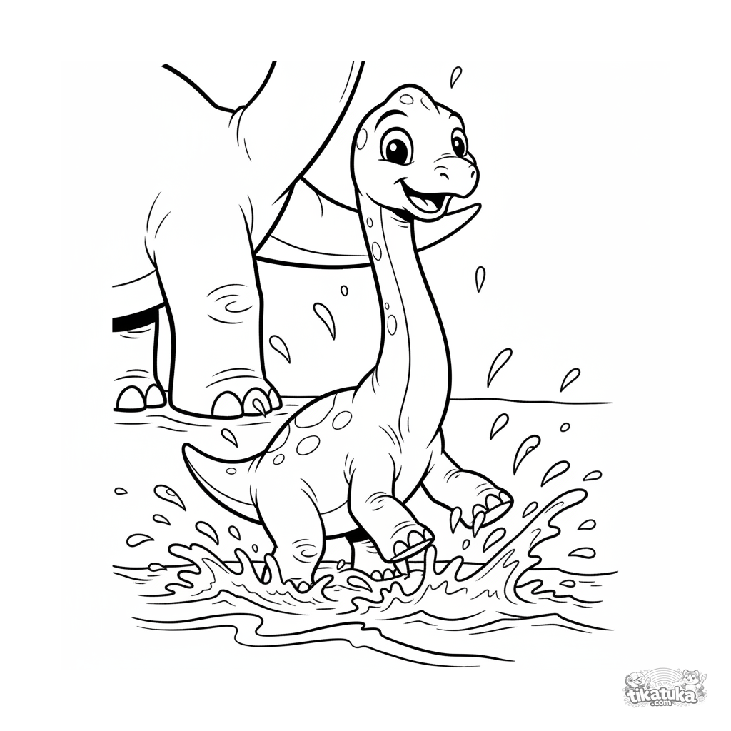Coloring page for tweens 7-9: a joyful baby brachiosaurus frolics in the waves of an ancient ocean. A dynamic, expressive scene in a 90s cartoon style.