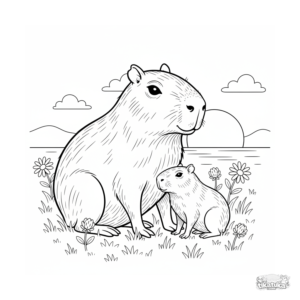 Coloring page for kids 4-6 years: a capybara parent and baby peacefully watch the sunset in a meadow. Simple shapes, a scene of tenderness and family bond.