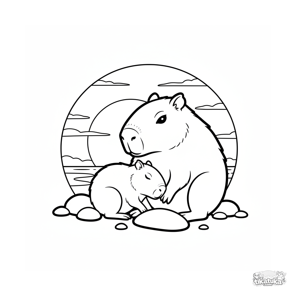 Simple coloring page for toddlers 2-3 years old: a sleeping baby capybara in a parent's lap against a sunset. Large shapes, few details.