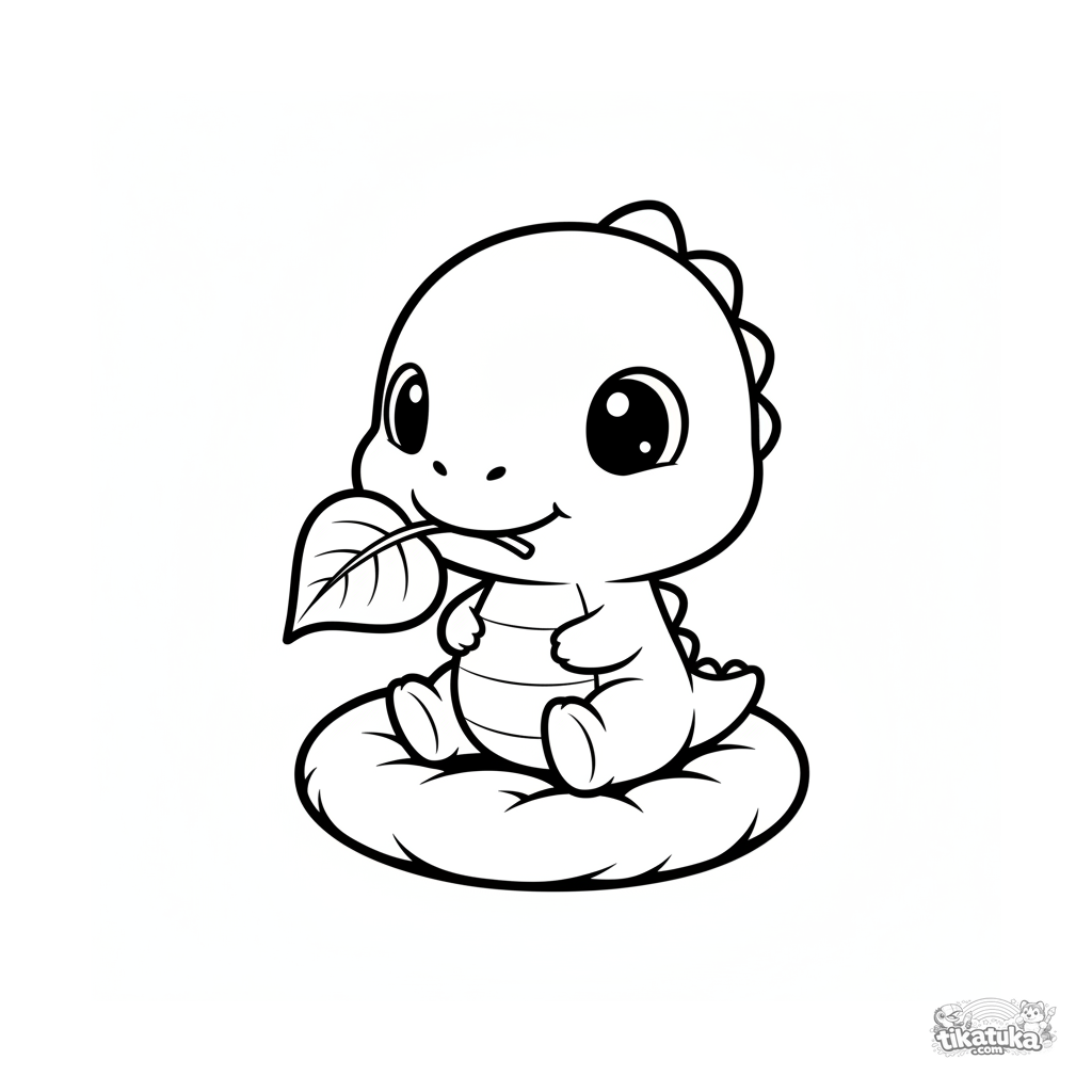 Coloring page for ages 2-3: a cute baby dinosaur with a leaf in its mouth sits on a pillow. Large head, simple shapes, wide clean margins.