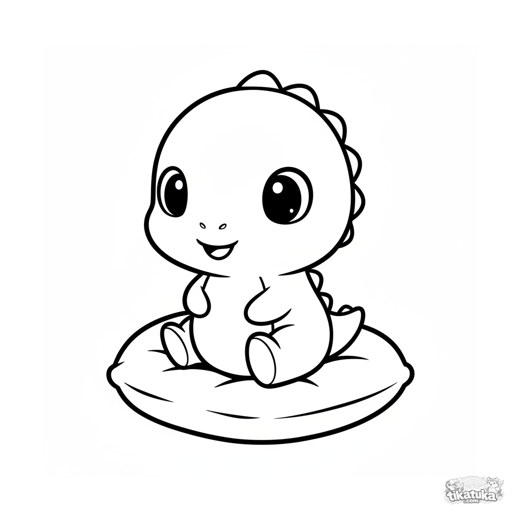 Coloring page for the very young: a curious baby dinosaur sits on a pillow. Huge head, simple shapes, perfect for ages 2-3.
