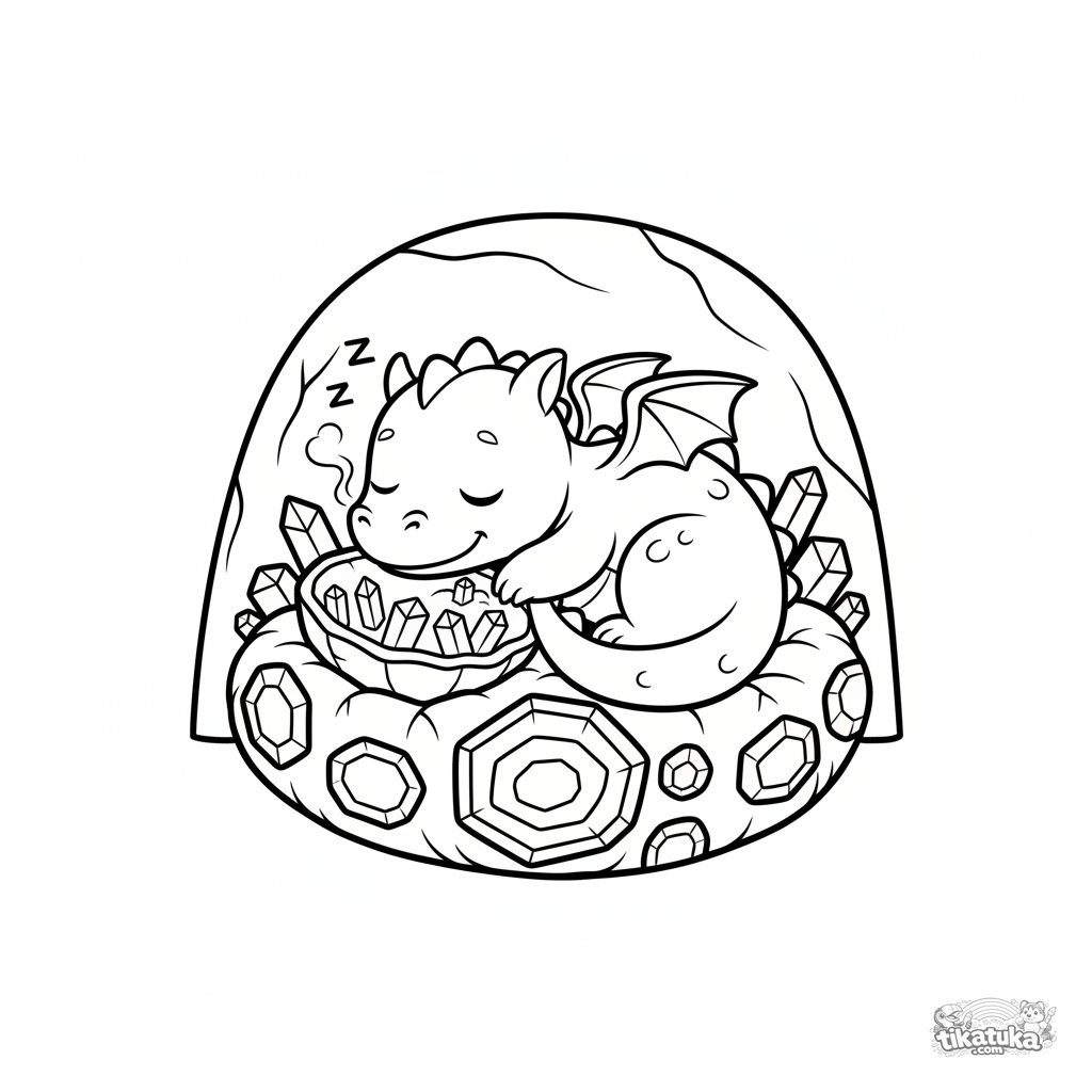 Coloring page for toddlers 2-3: a cute baby dragon naps in a nest of sparkling crystals. Simple scene with large shapes and wide margins for coloring.