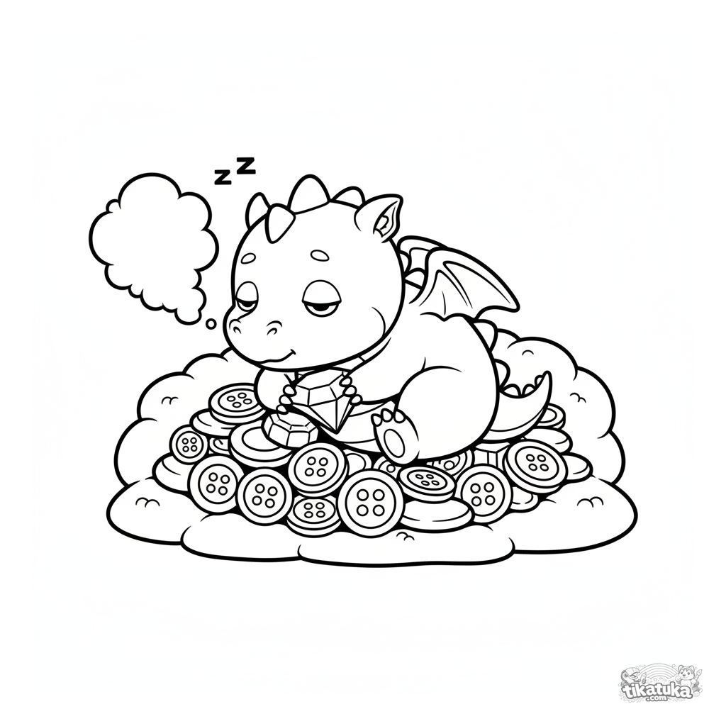 Simple coloring page for toddlers 2-3: a cute baby dragon naps on a pile of shiny trinkets. Large clear shapes, few details, perfect for first crayons.