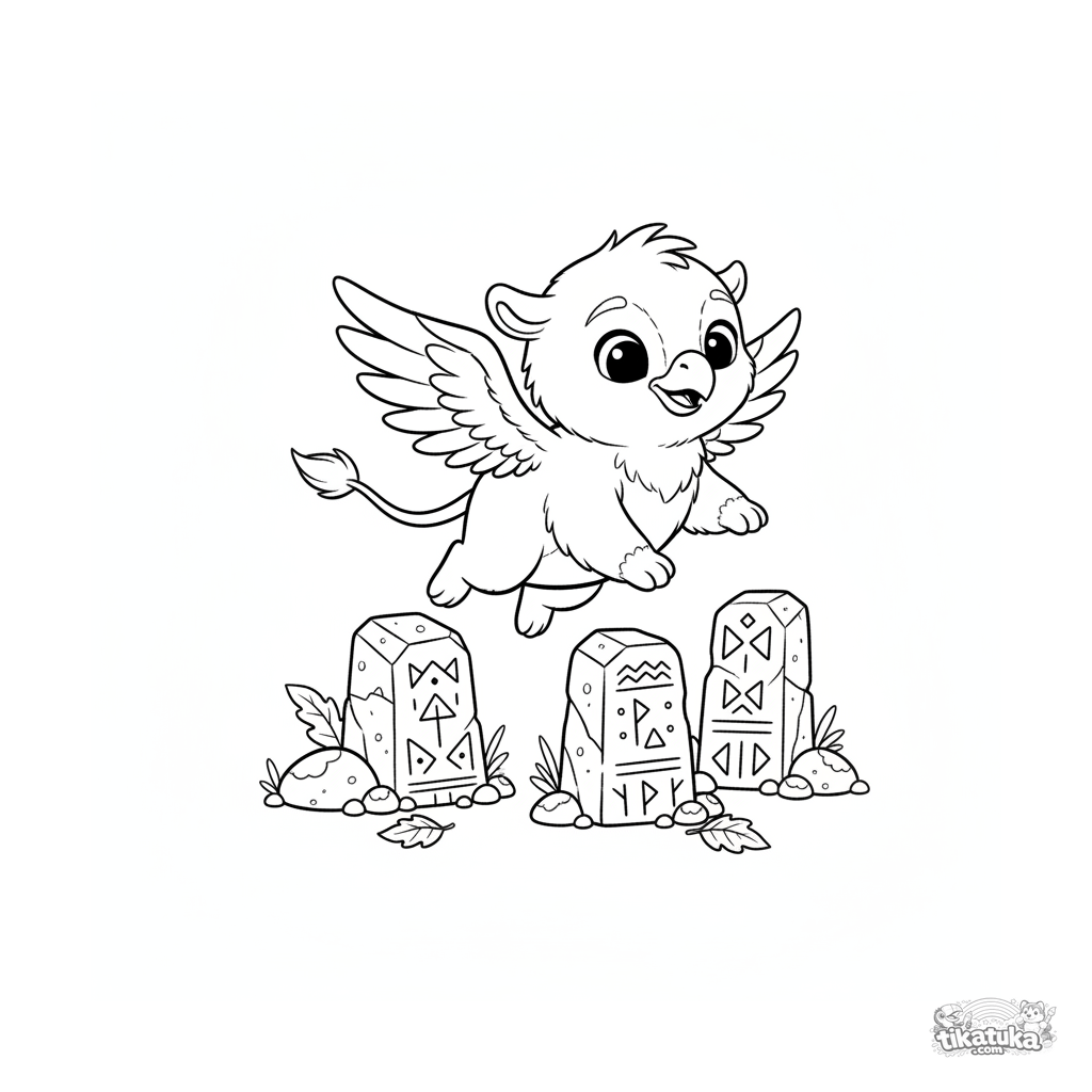 Coloring page of a baby griffin playing among ancient rune-carved monoliths. For kids 4-6 years old. Mythical creature in a magical setting.