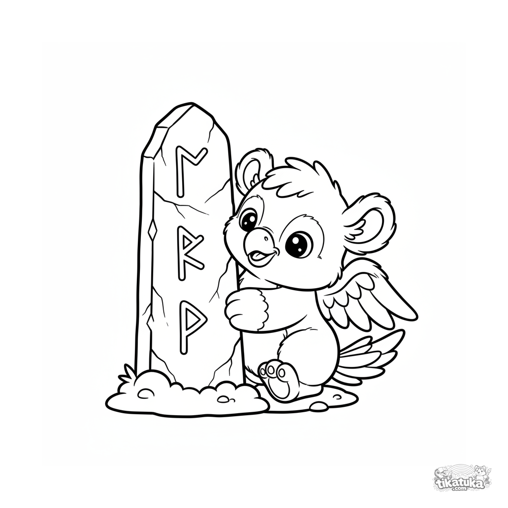 Toddler coloring page: a fluffy baby griffin peeks from behind an ancient rune-covered monolith. Simple shapes, wide margins for coloring.