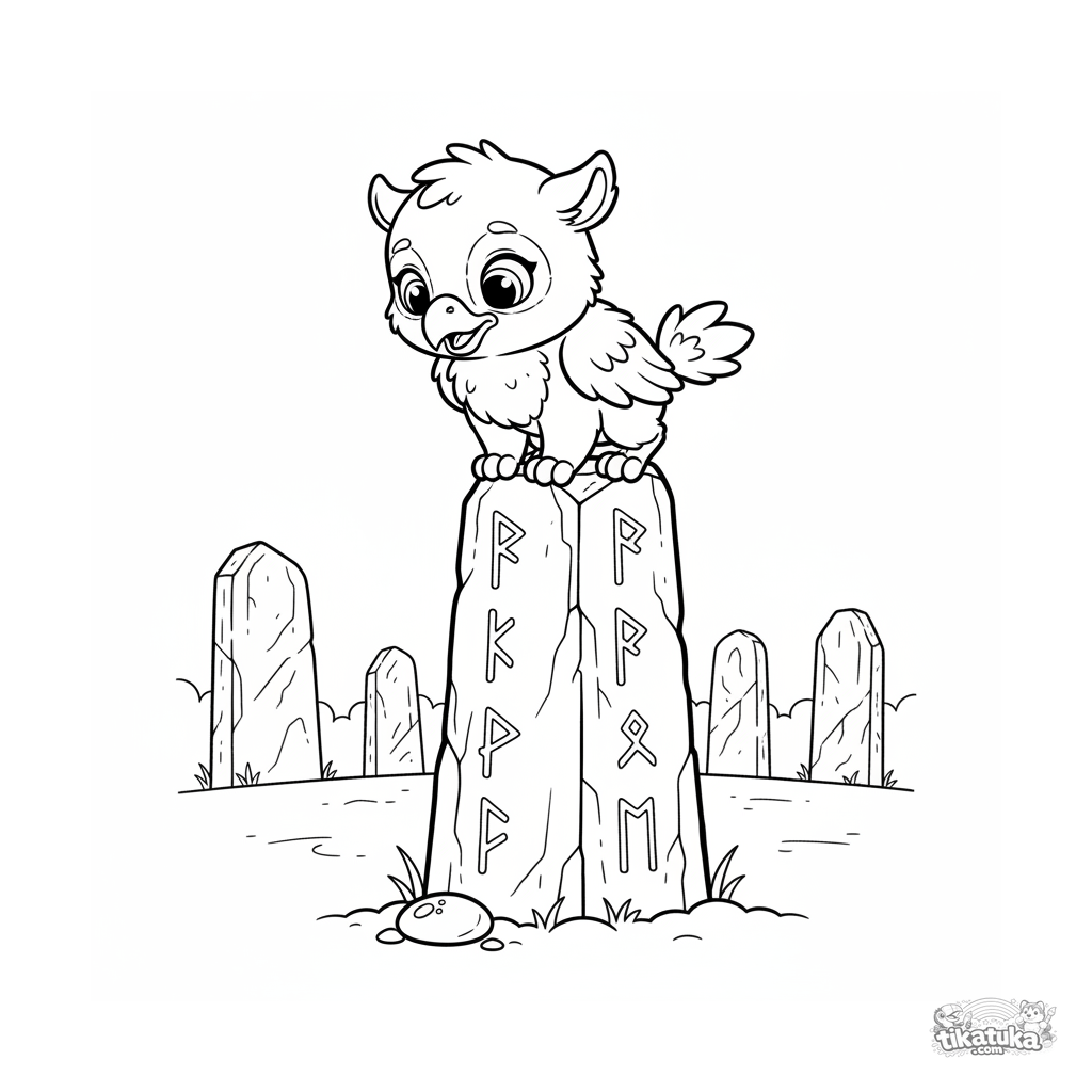 Coloring page for kids 4-6: a curious baby griffin perches on an ancient rune-carved monolith. Simple shapes, friendly character.