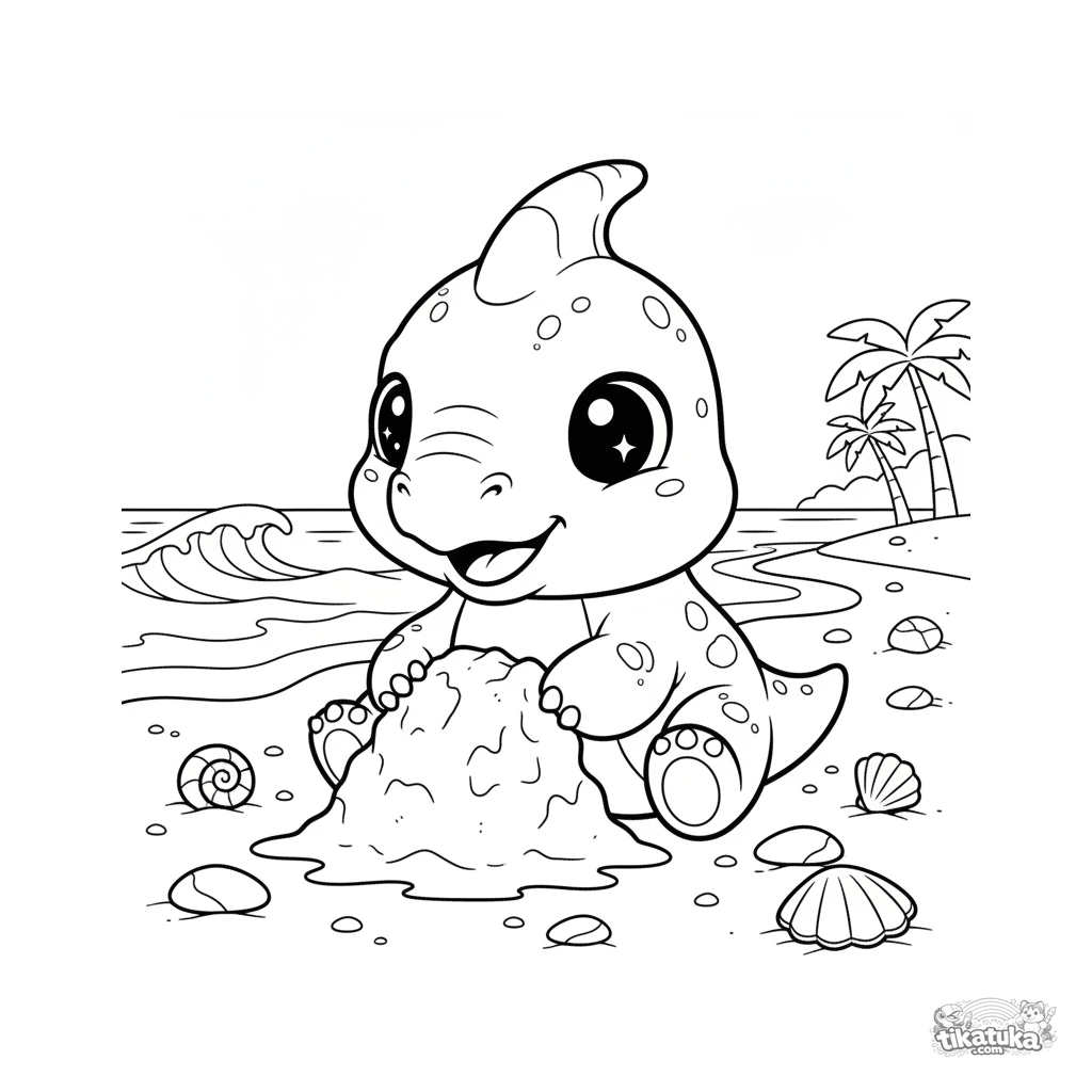 Coloring page for kids 4-6: a baby parasaurolophus builds a sand castle on an ancient ocean beach. A cute and simple scene for creativity.