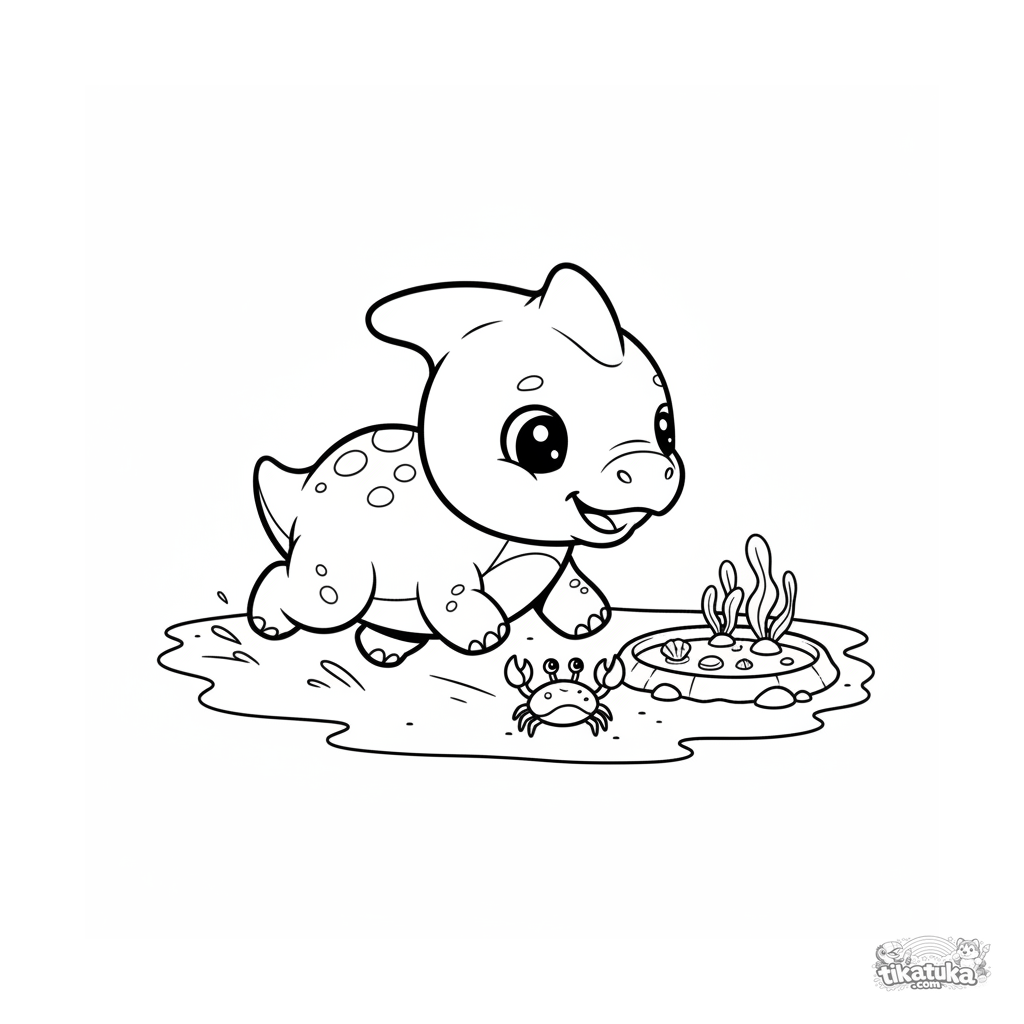Simple coloring page for toddlers 2-3 years old: a baby parasaurolophus chases a little crab on an ancient beach. Large shapes, few details.