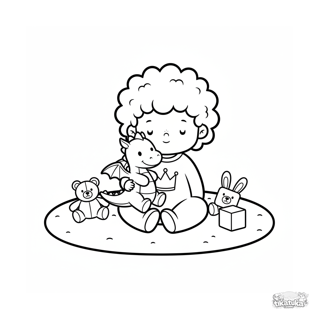 Coloring page for toddlers 2-3: a baby princess hugs a big plush dragon toy in a nursery. Huge simple shapes, thick outlines, few details.