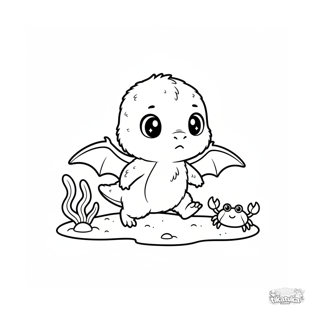 Simple coloring page for toddlers 2-3: a fluffy baby pterosaur taking its first steps on the sand of an ancient beach. Large simple shapes, few details.
