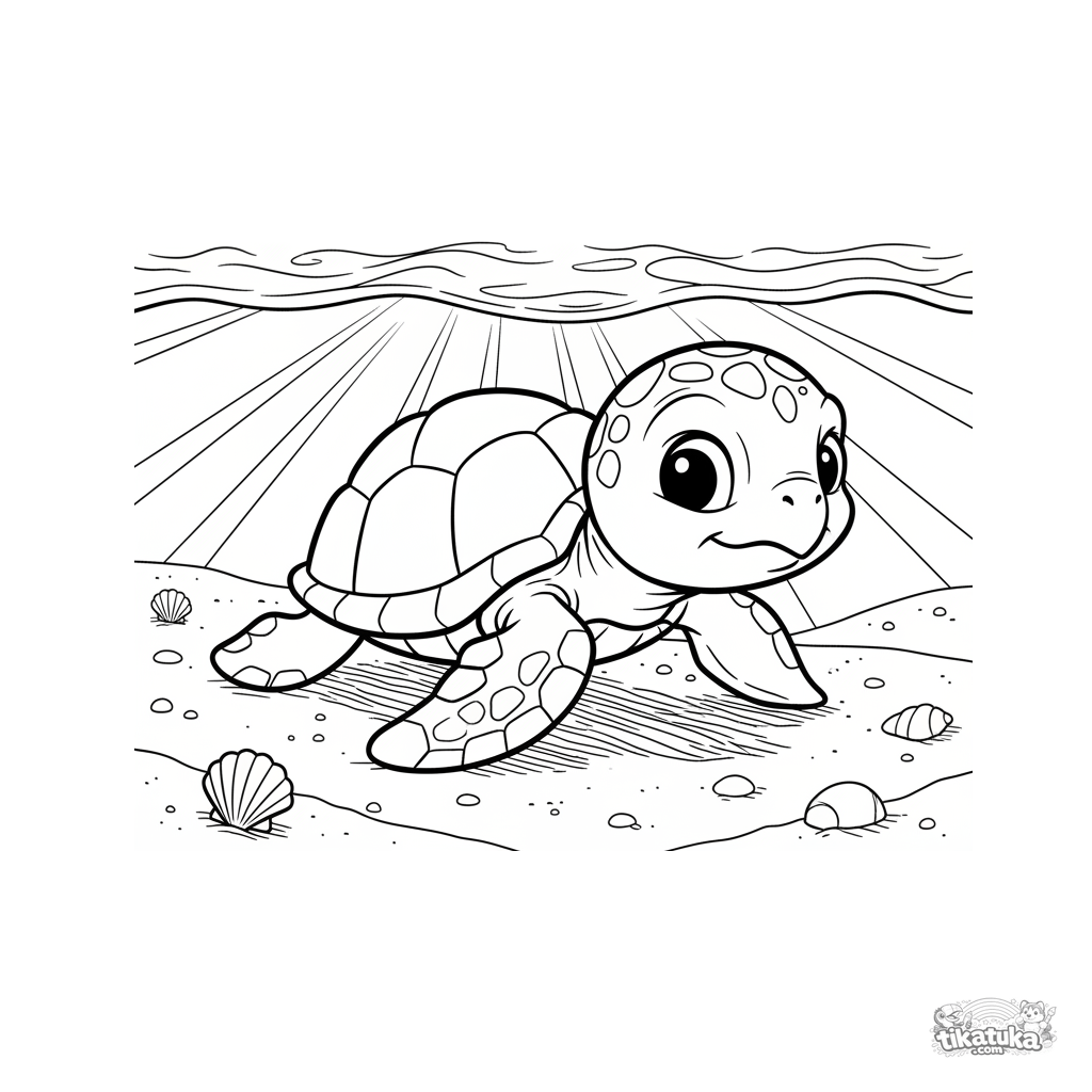 Coloring page for tweens 7-9 years: a baby sea turtle crawls across sand toward the sunny surface in shallow water. Expressive pose, moderate detail.