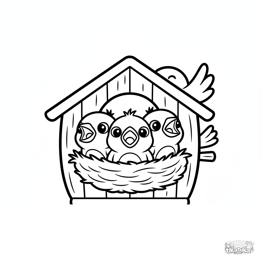 Coloring page for toddlers 2-3: three fluffy baby sparrows in a cozy nest inside a wooden birdhouse. Simple large shapes, few details.