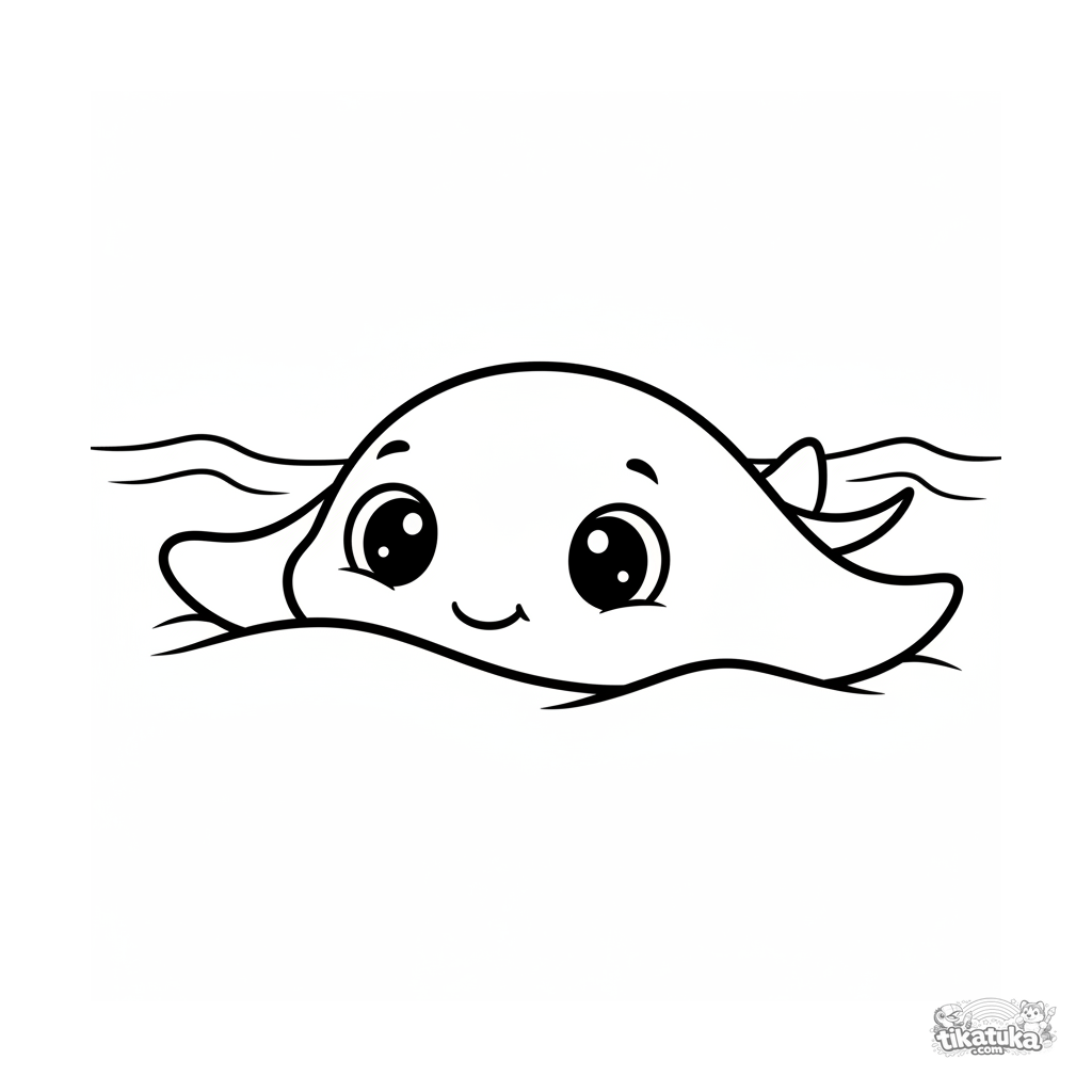 Simple coloring page for toddlers 2-3: a baby stingray playing hide-and-seek buried in sand on the shallows. Large shapes, thick outlines, plenty of white space.