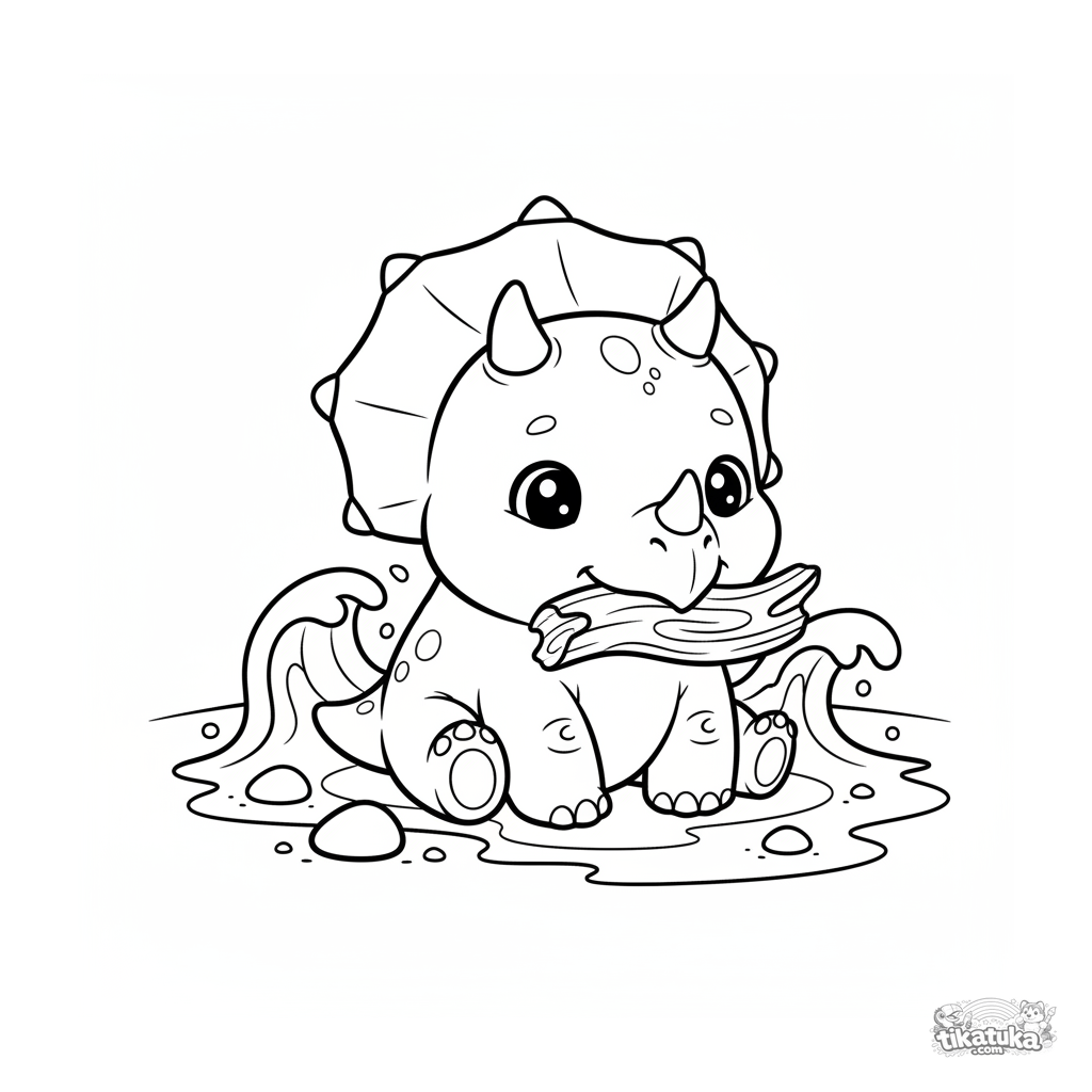 Simple coloring page for toddlers 2-3: a baby triceratops with a stick on the sand. Large shapes and minimal details.