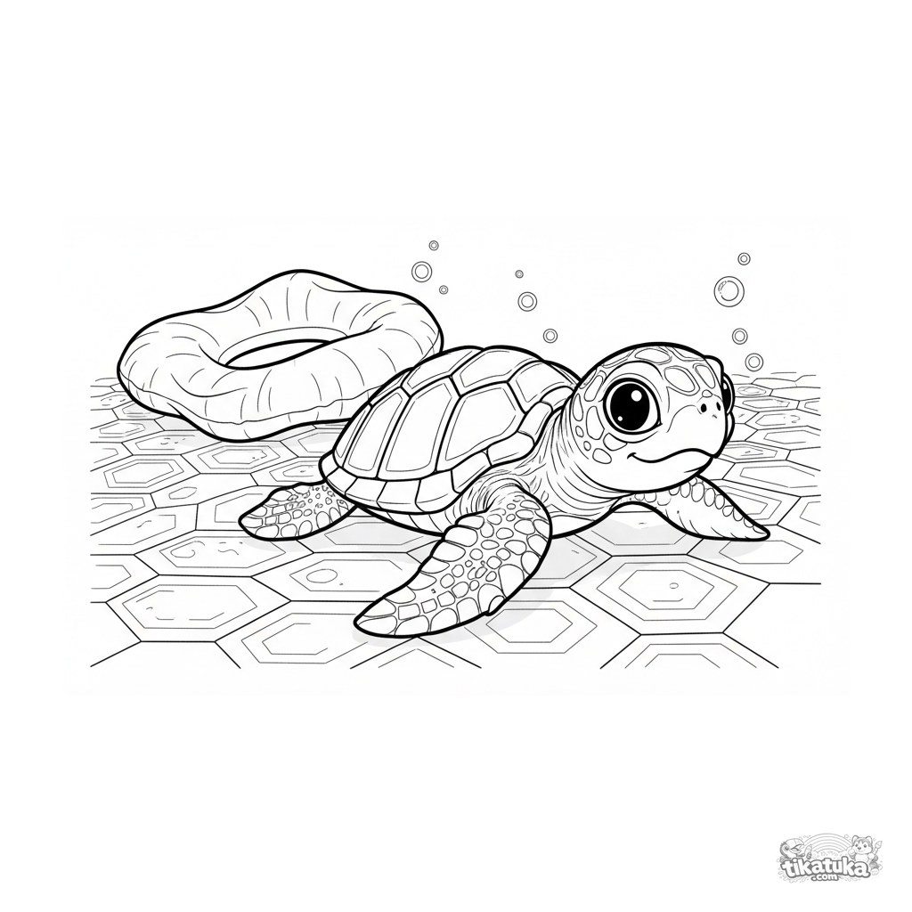 Coloring page for tweens 7-9: a baby turtle explores the patterned tiles on a pool bottom near a deflated ring. Moderate detail, educational theme of exploration.