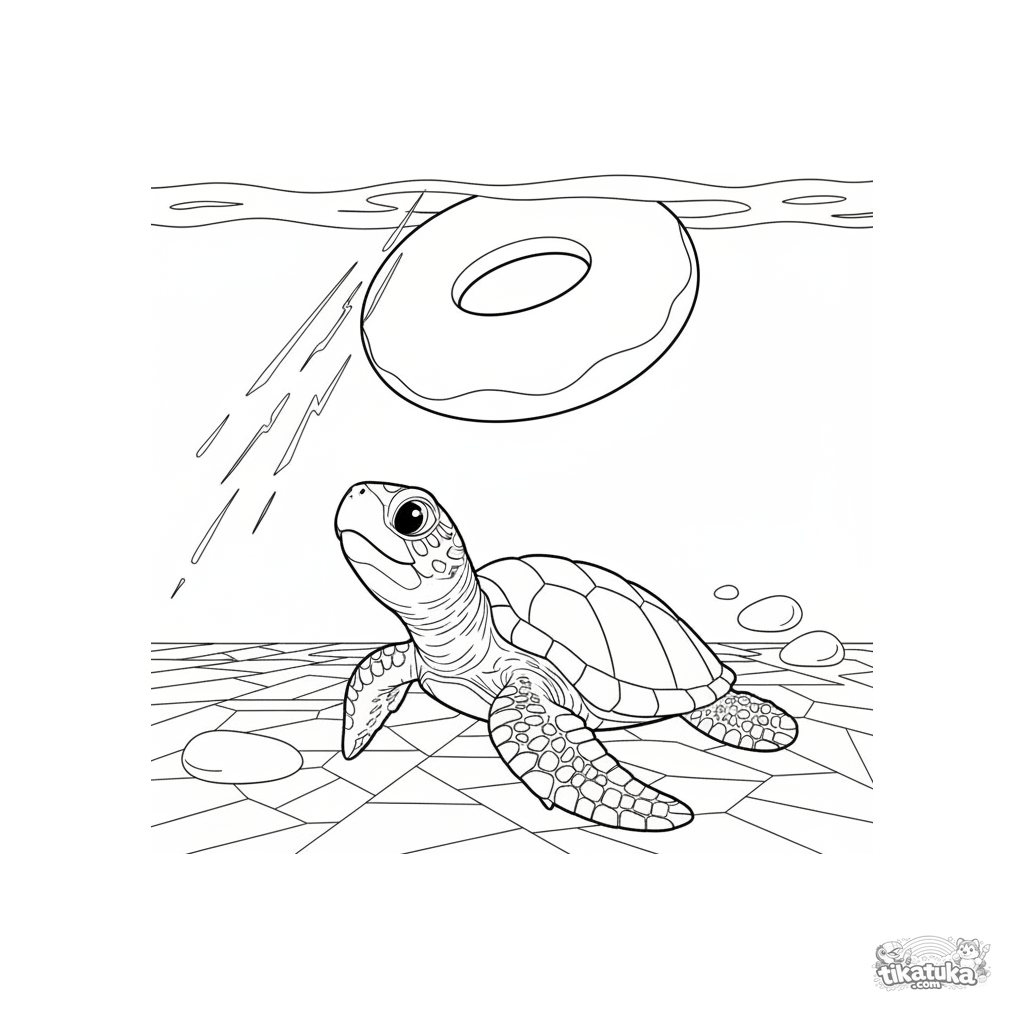 Detailed coloring page for ages 10-12: a baby turtle crawls on tiles at the bottom of a pool, looking up at an inflatable ring on the surface. Realistic lines, light play.