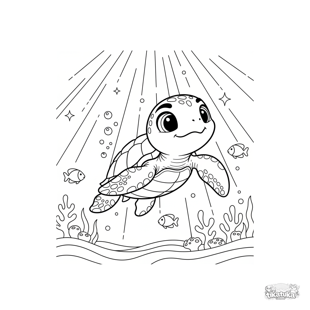 Coloring page for tweens 7-9: a newly hatched baby sea turtle swimming towards the surface in a column of sunlight in shallow water.