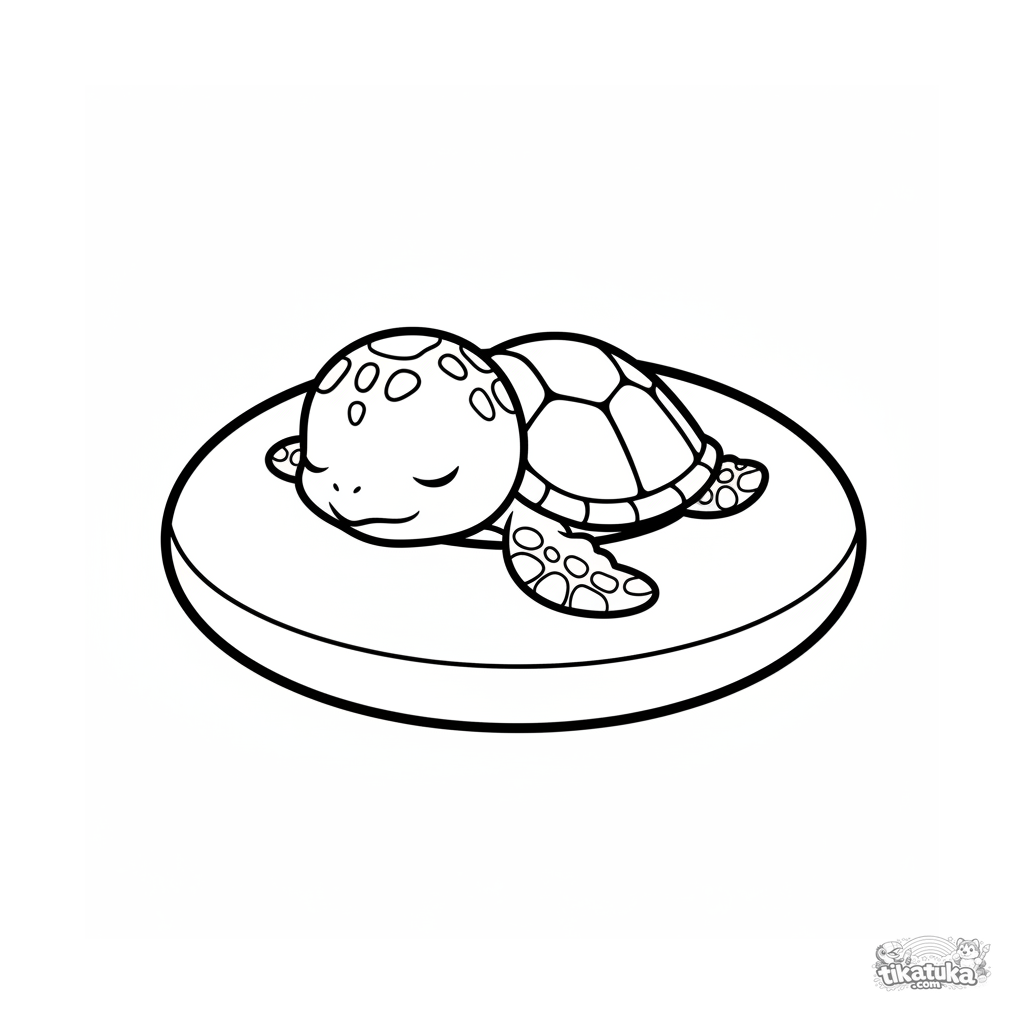 Simple coloring page for toddlers 2-3: a tiny baby turtle naps inside an inner tube on the pool floor. Large shapes, very few details, wide margins.
