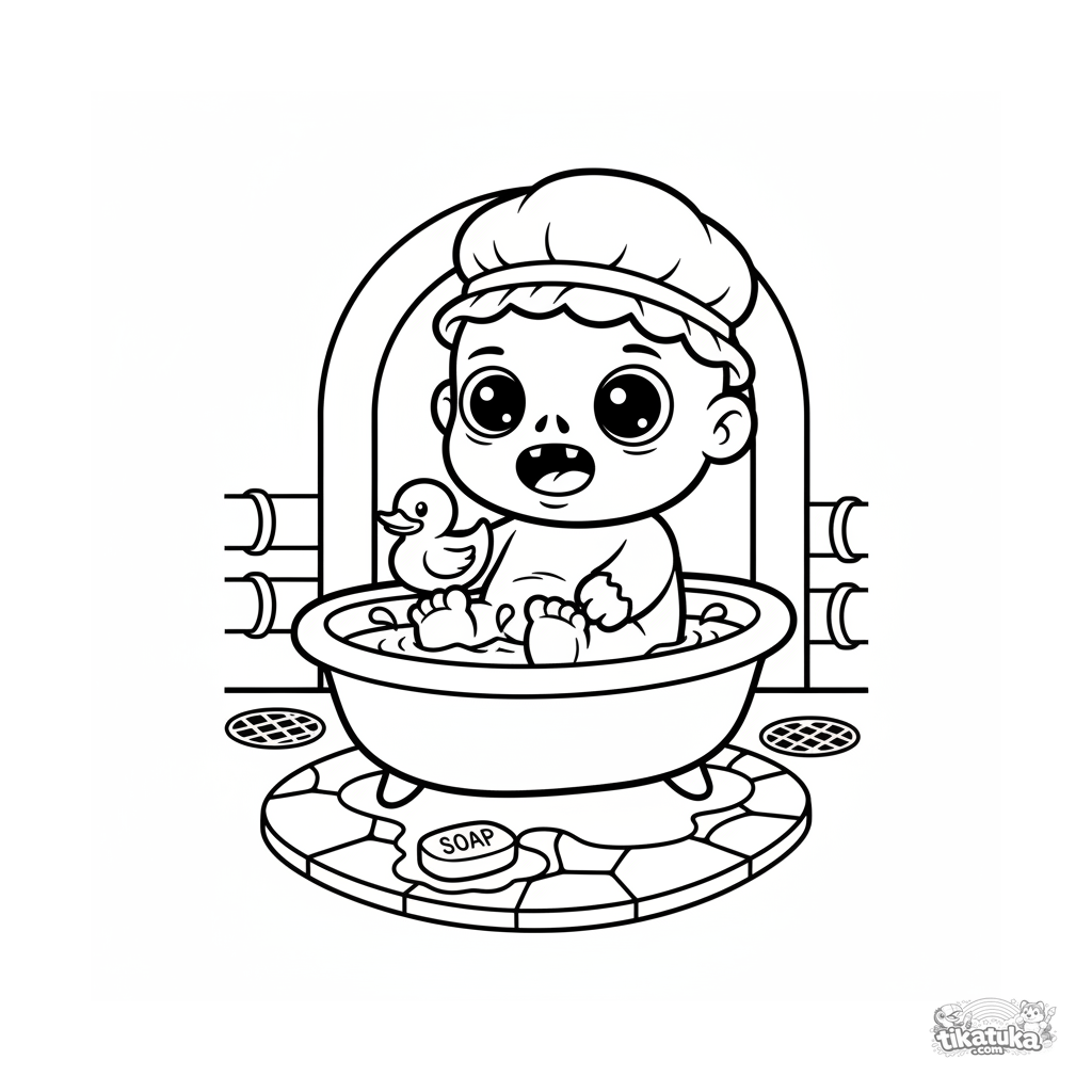 Simple coloring page for toddlers: a cute baby zombie taking a bath in a tub in the sewer. Large shapes, thick outlines, very few details. For kids 2-3 years old.