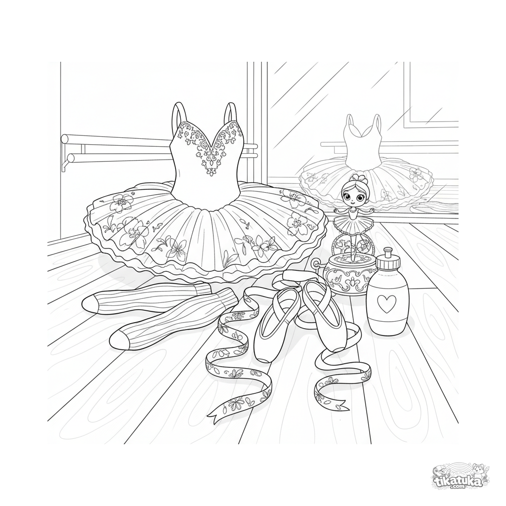 Coloring page for ages 10-12: a flat lay of a ballet tutu, warm-ups, and accessories on a dance studio floor. Watercolor sketch style, many details.