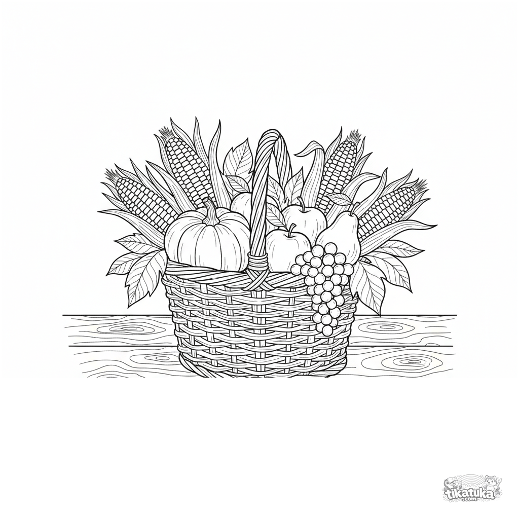 Detailed coloring page for ages 10-12: a basket full of autumn harvest. Realistic watercolor-sketch style, cozy still life on a wooden table.