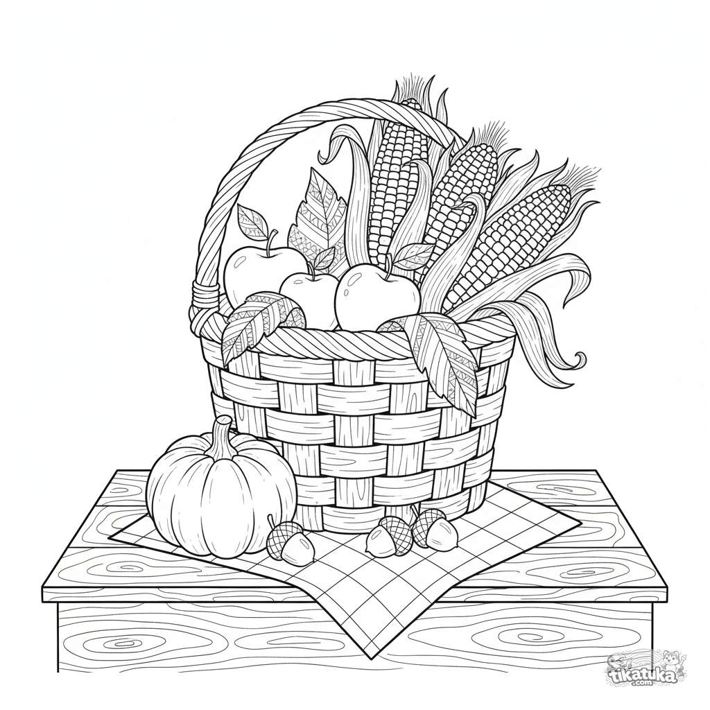 Detailed coloring page: a basket with autumn harvest of pumpkin, apples, and corn. For older kids 10-12 years. Cozy watercolor-sketch style scene.