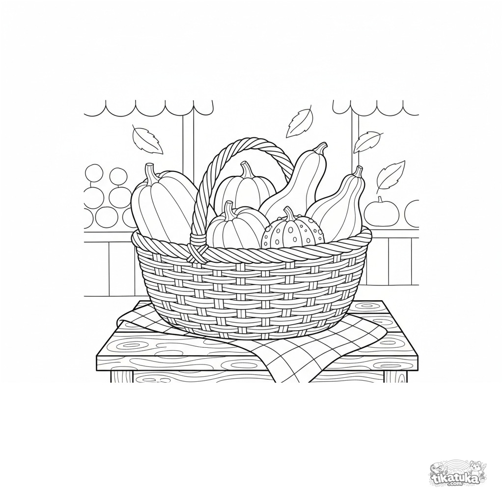 Coloring page of a basket full of fall squash at a farmer's market. For tweens 7-9. Variety of gourds in a woven basket.