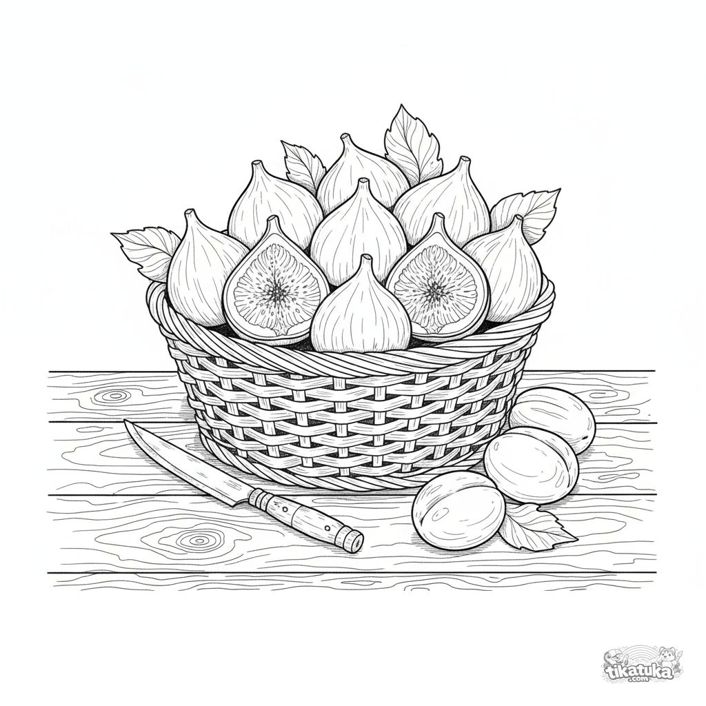 Coloring page for older kids 10-12: a detailed still-life of a basket overflowing with figs and plums. Watercolor-sketch style, textures of wood and fruit.