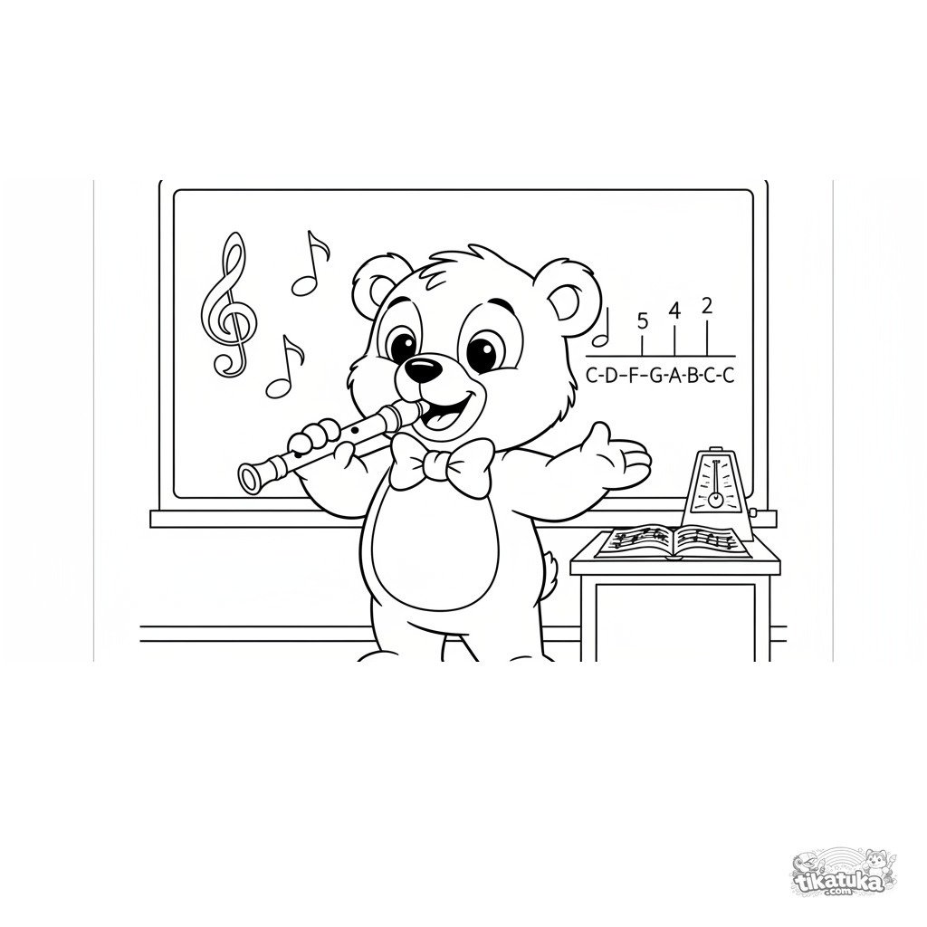 Coloring page for tweens 7-9: a jovial bear music teacher with a recorder by a blackboard with musical notes. Classic cartoon aesthetic, dynamic pose.