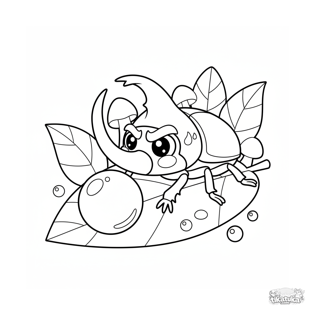 Coloring page for kids 4-6: a mighty rhinoceros beetle rolls a large dewdrop across a leaf. Dynamic comic-adventure outlines, expressive pose, balanced details.