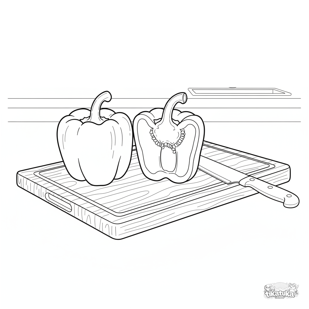 Coloring page for tweens 7-9: a green bell pepper on a cutting board, shown whole and halved. Realistic style with moderate detail for engaging coloring.