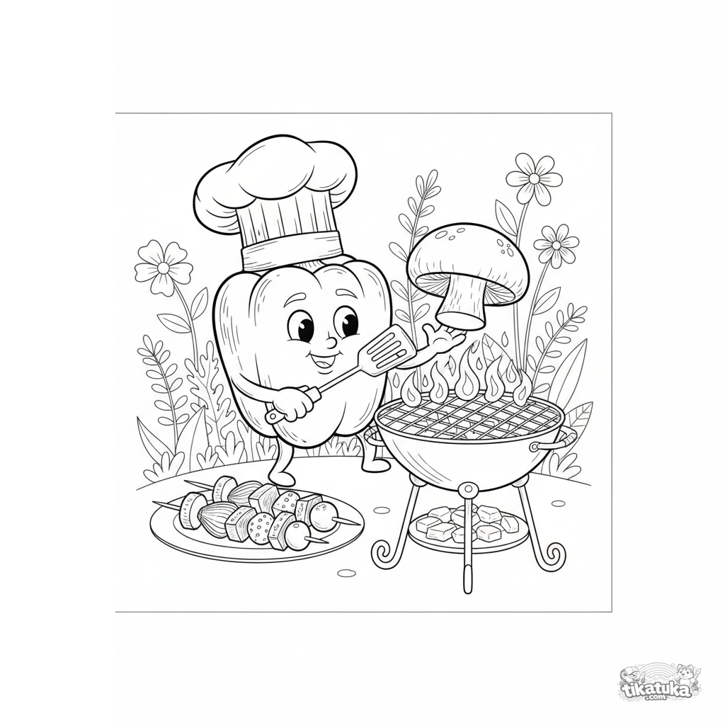 Detailed coloring page for ages 10-12: a bell pepper chef cooking on a garden grill. Realistic field-guide style with vegetable still life details.