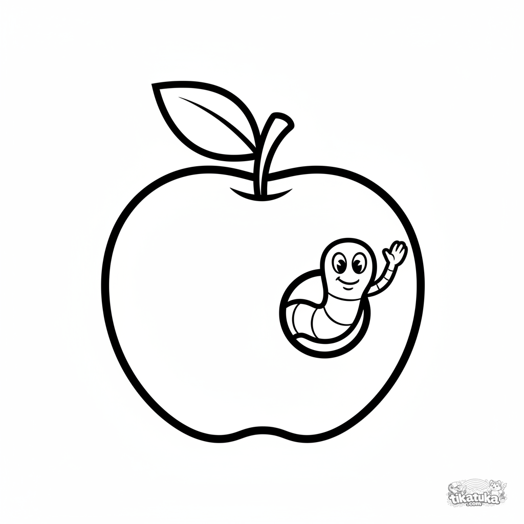 Toddler coloring page for ages 2-3: a big apple and a happy worm. Minimalist design, huge areas to color, clear shapes. Paint by numbers coloring page for kids.
