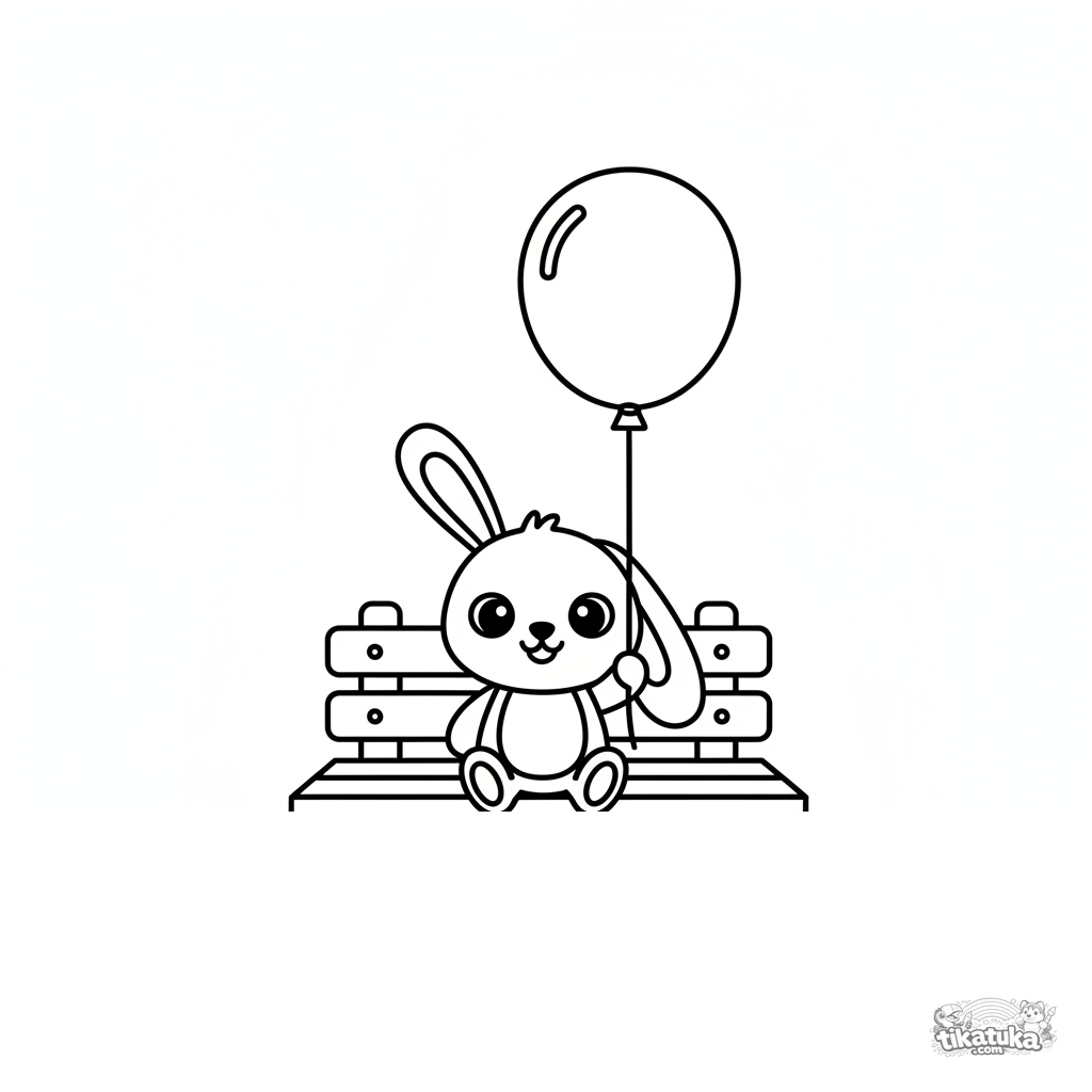 Simple coloring page for toddlers 2-3: a big plush bunny with a balloon sits on a bench. Large, clear shapes and wide margins for first coloring.