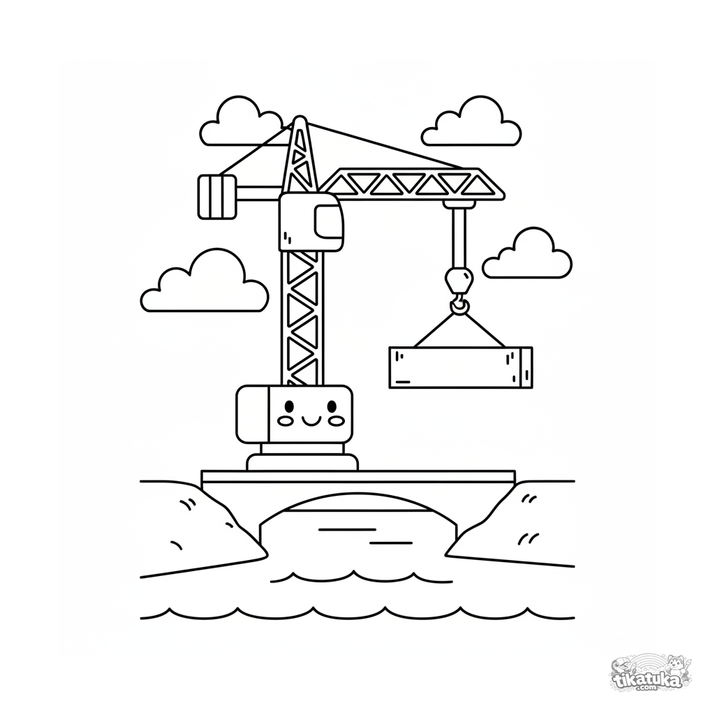 Simple coloring page for toddlers 2-3: a big construction crane working on a bridge over a river. Large, clear shapes, few details, perfect for first crayons.
