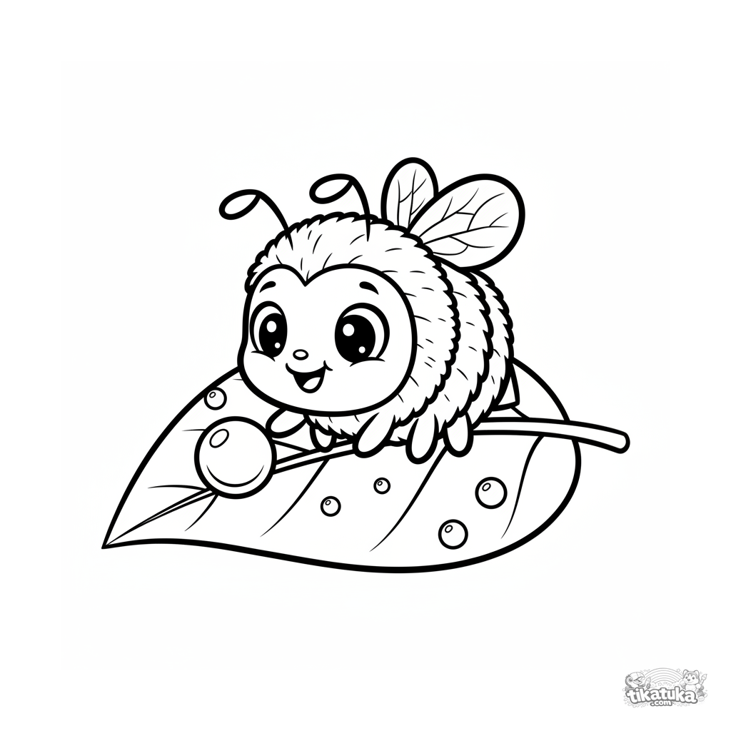 Very simple coloring page for toddlers 2-3: a fluffy bumblebee with big eyes sits on a leaf and touches a dewdrop. Large shapes, wide margins.