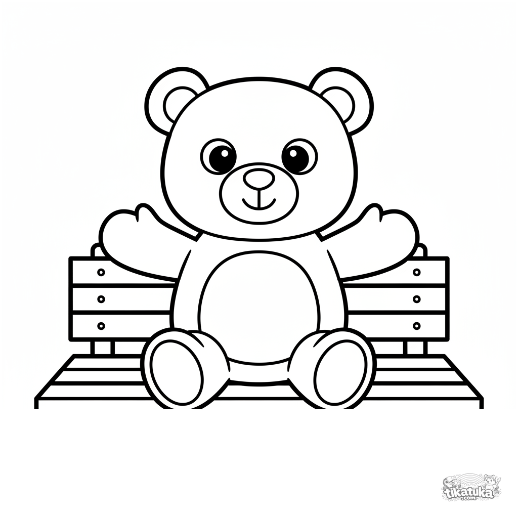 Very simple coloring page for toddlers 2-3: a big plush teddy bear sits on a park bench. Large shapes, lots of open space for coloring.