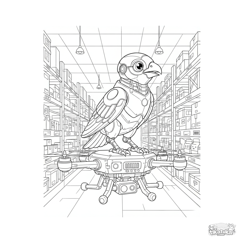 Coloring page for older kids 10-12: a realistic bird-shaped robot perched on a flying scanner drone, observing a warehouse. Detailed mechanical forms.