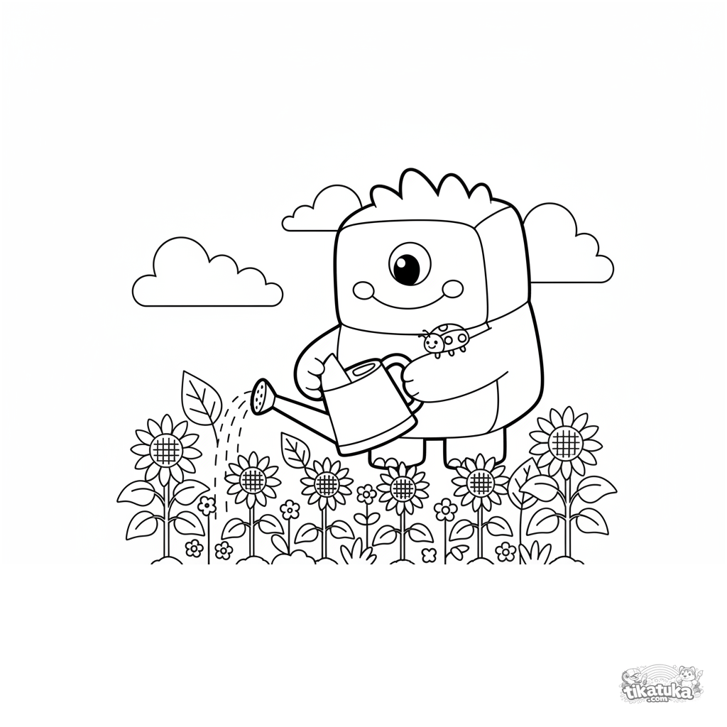 Coloring page for kids 4-6: a blocky monster with one eye watering sunflowers in a garden. A cute and peaceful scene with a ladybug.