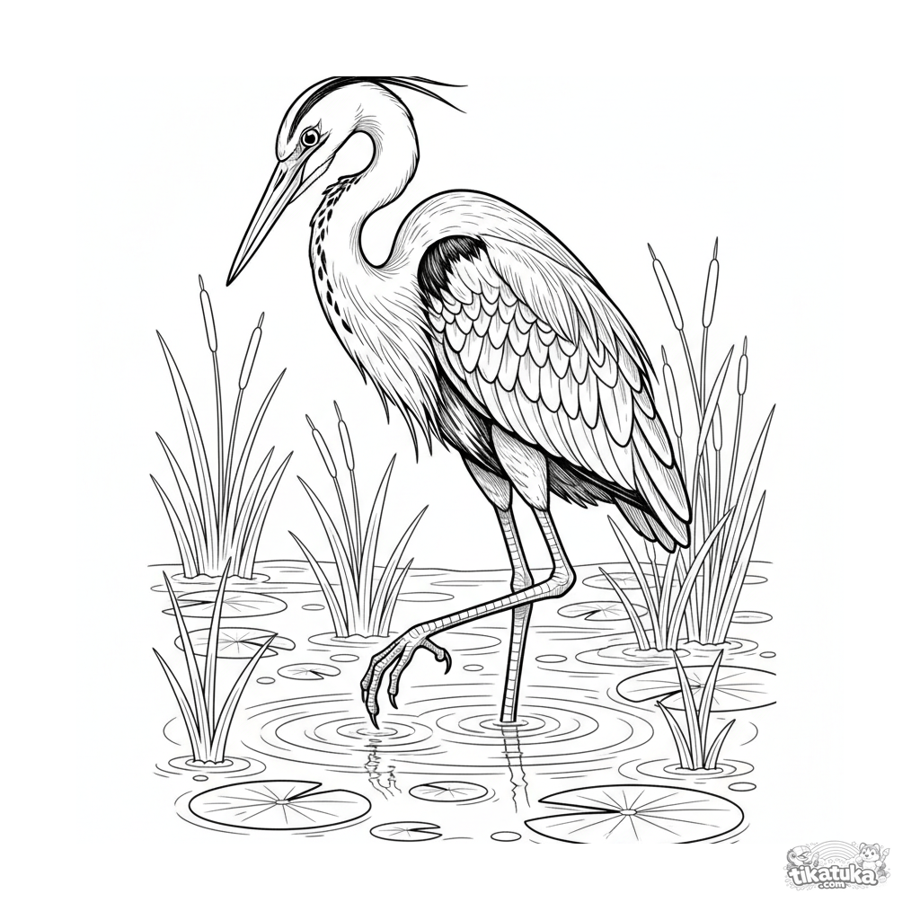 Detailed coloring page for kids 10-12: an elegant heron stands in a clear stream, watching for prey. Realistic illustration with reeds and lily pads.