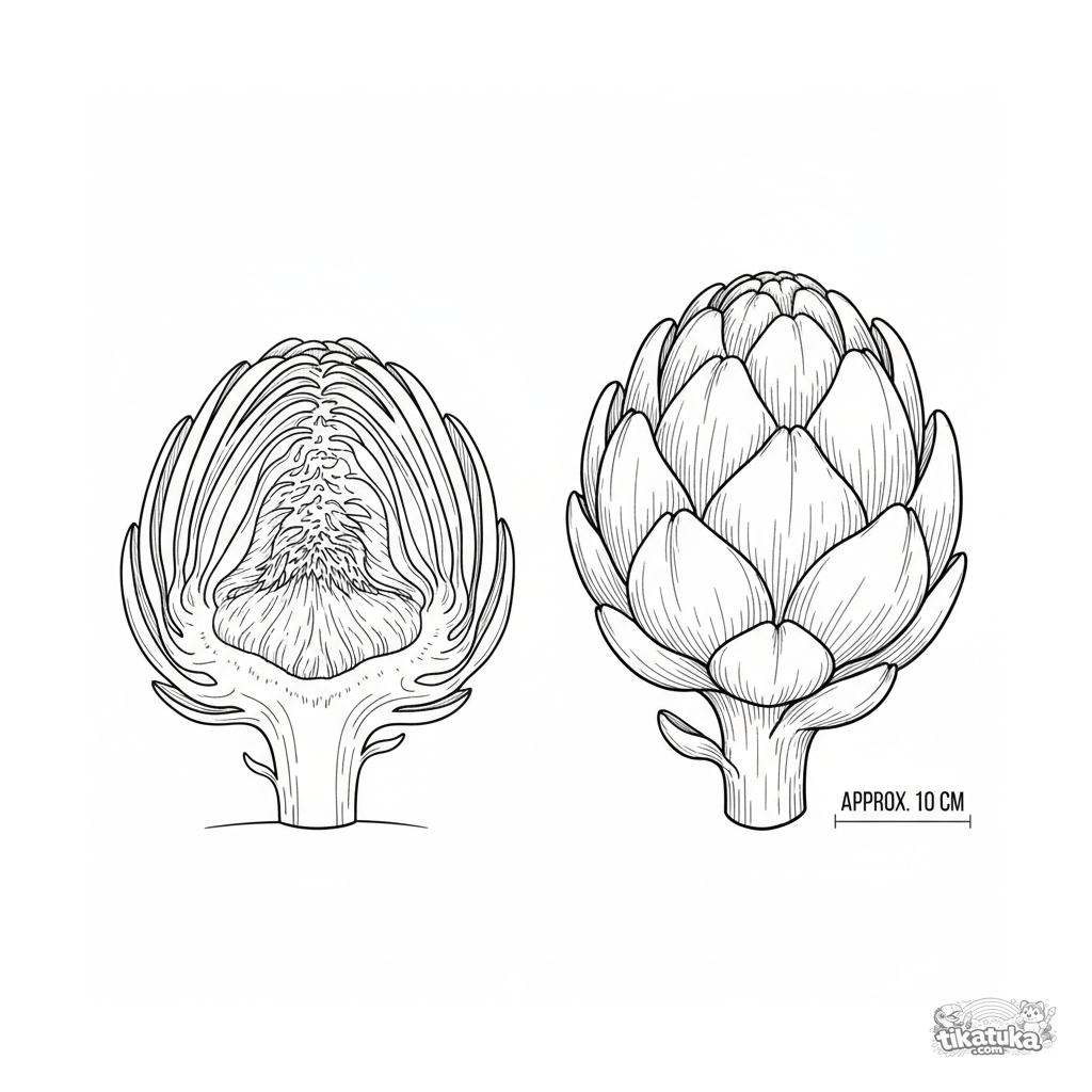 Coloring page for older kids 10-12: a detailed botanical cross-section of an artichoke in a scientific field-guide style. Educational illustration with clean lines.