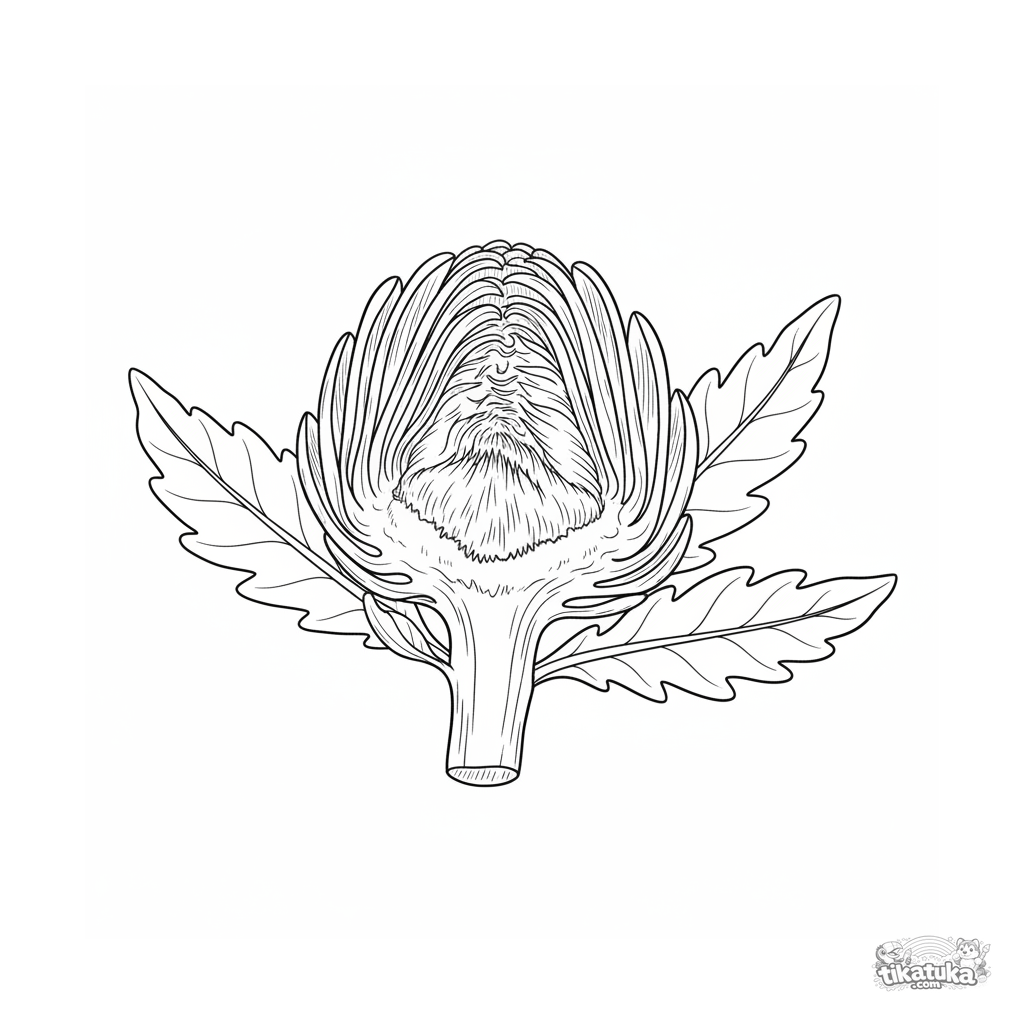 Detailed botanical coloring page: an artichoke cross-section. For older kids 10-12 years. Educational field-guide style illustration.