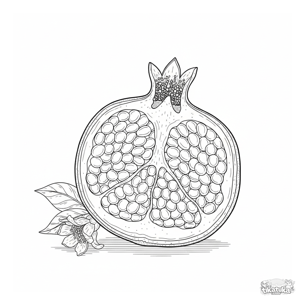 Educational coloring page for ages 10-12: a detailed botanical cross-section of a pomegranate showing seeds. Intricate outlines for careful coloring.