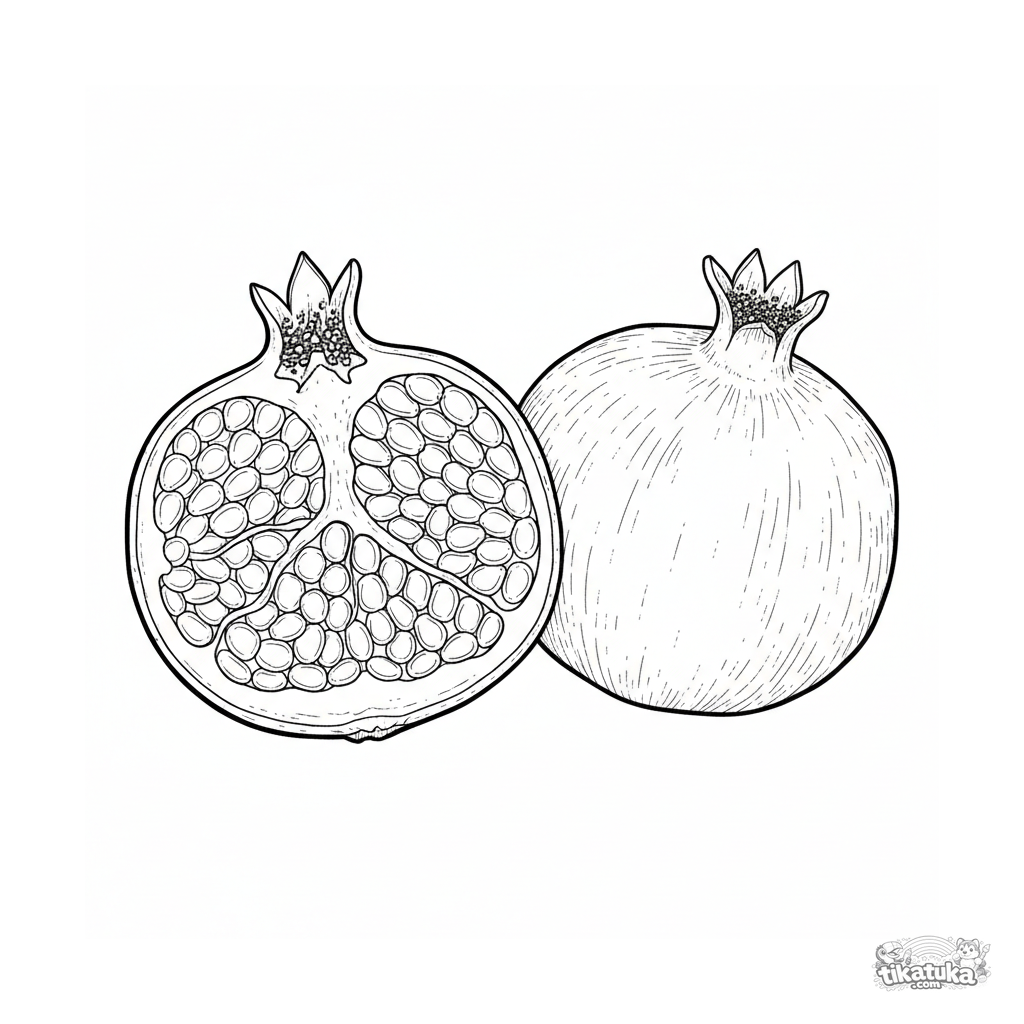 Detailed botanical coloring page of a pomegranate cross-section for ages 10-12. Shows seed chambers and calyx in a scientific field-guide style.