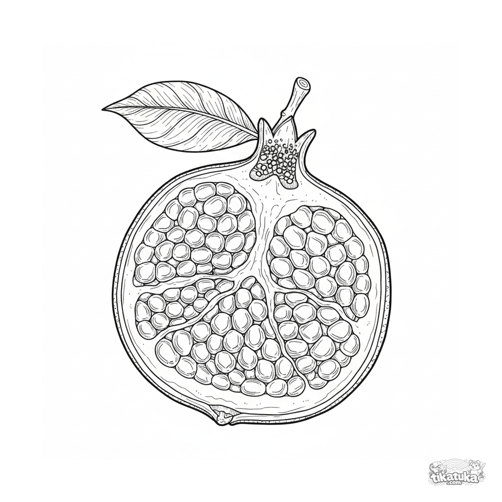 Educational coloring page for ages 10-12: a detailed botanical cross-section of a pomegranate showing its internal structure. Clean white background.