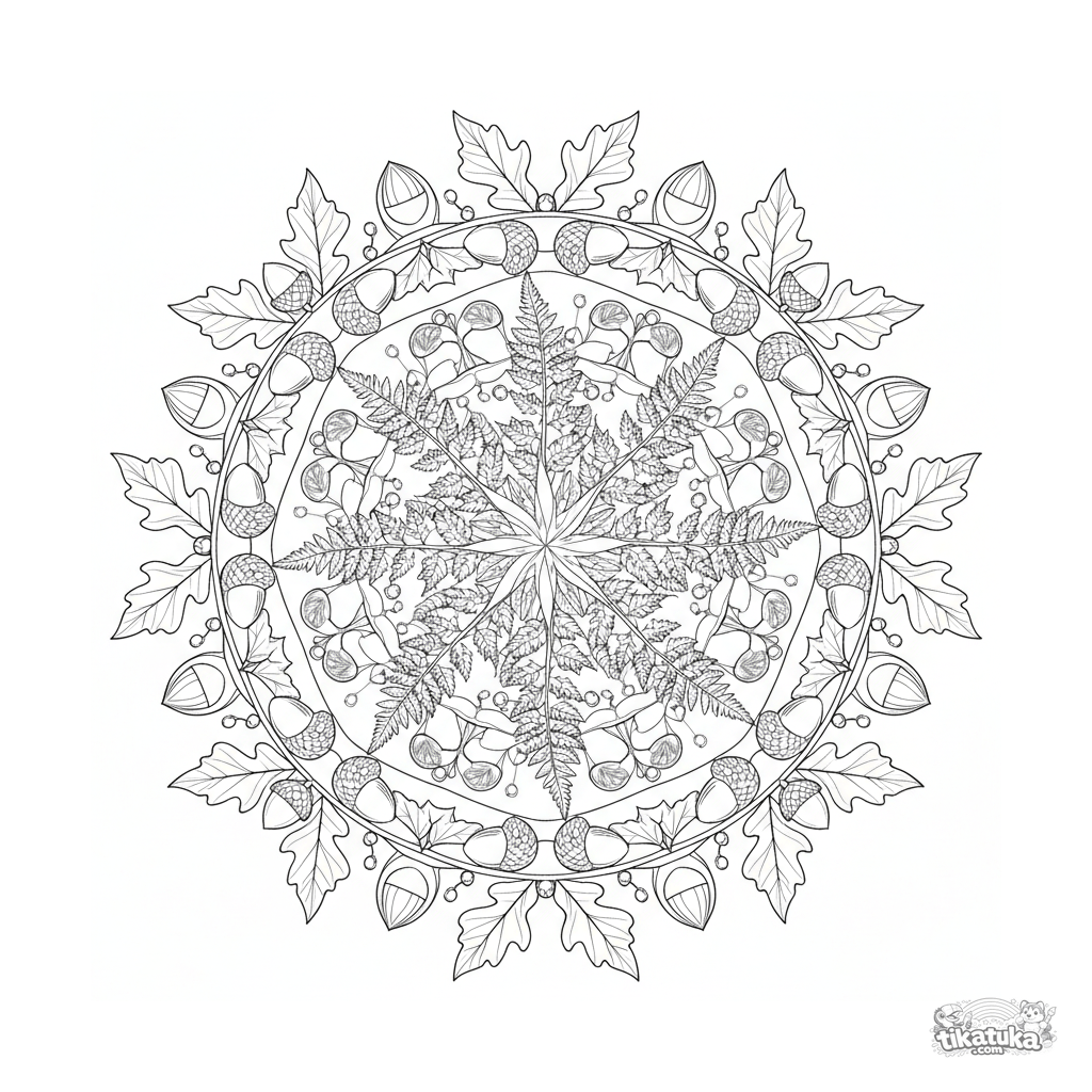 Detailed botanical mandala coloring page for ages 10-12. Ferns, seed pods, ivy, acorns—a complex symmetrical pattern inspired by nature, perfect for patient and detailed coloring.