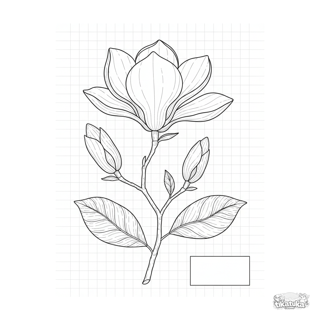 Detailed coloring page for kids 10-12: a magnolia branch as a botanical pressed specimen. Precise lines, textures, educational style.